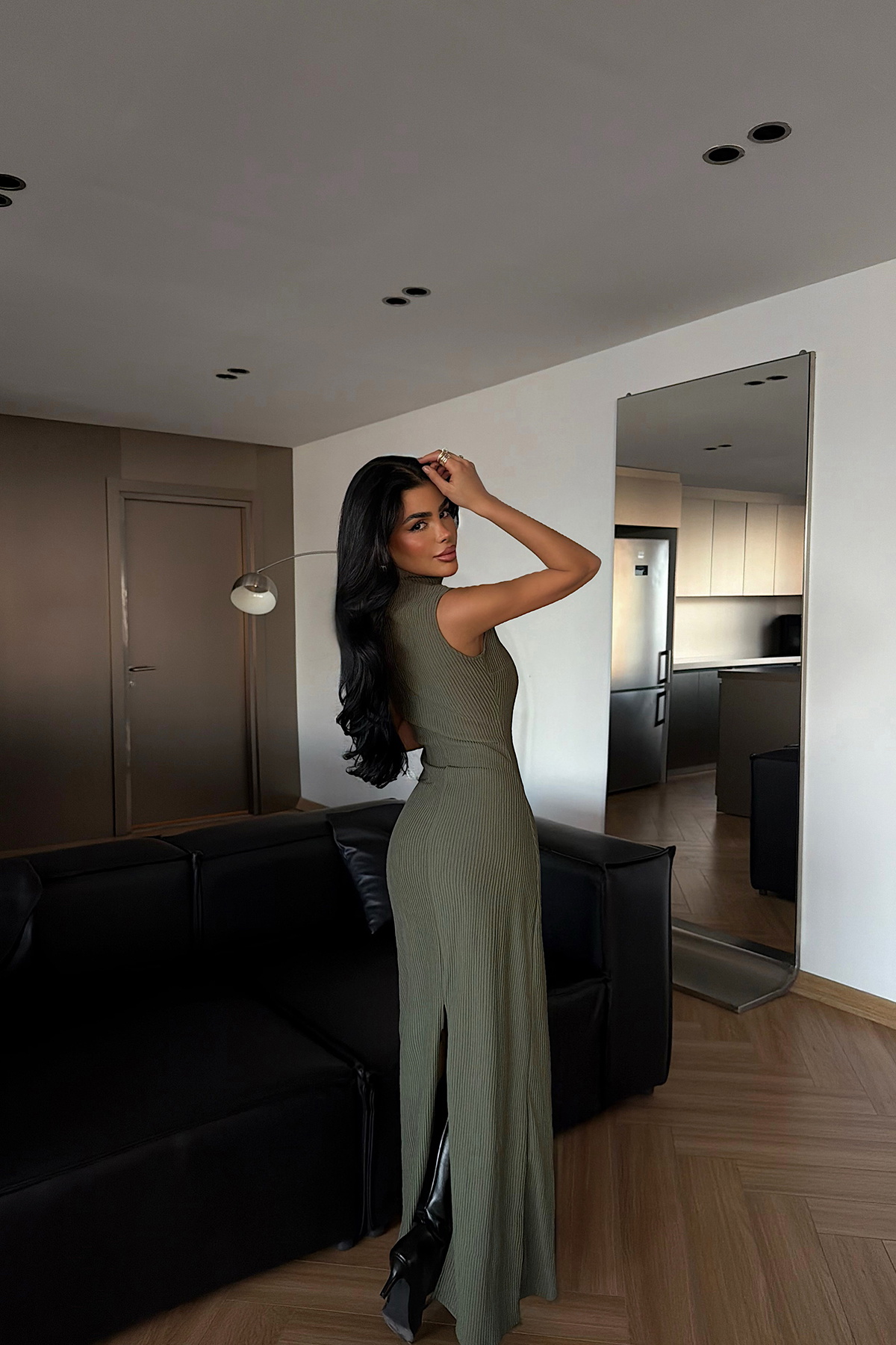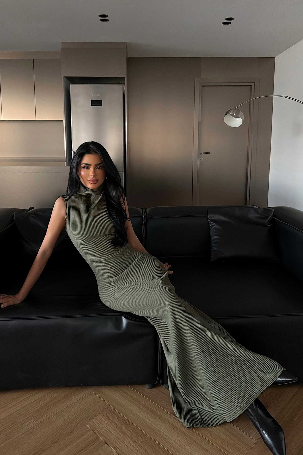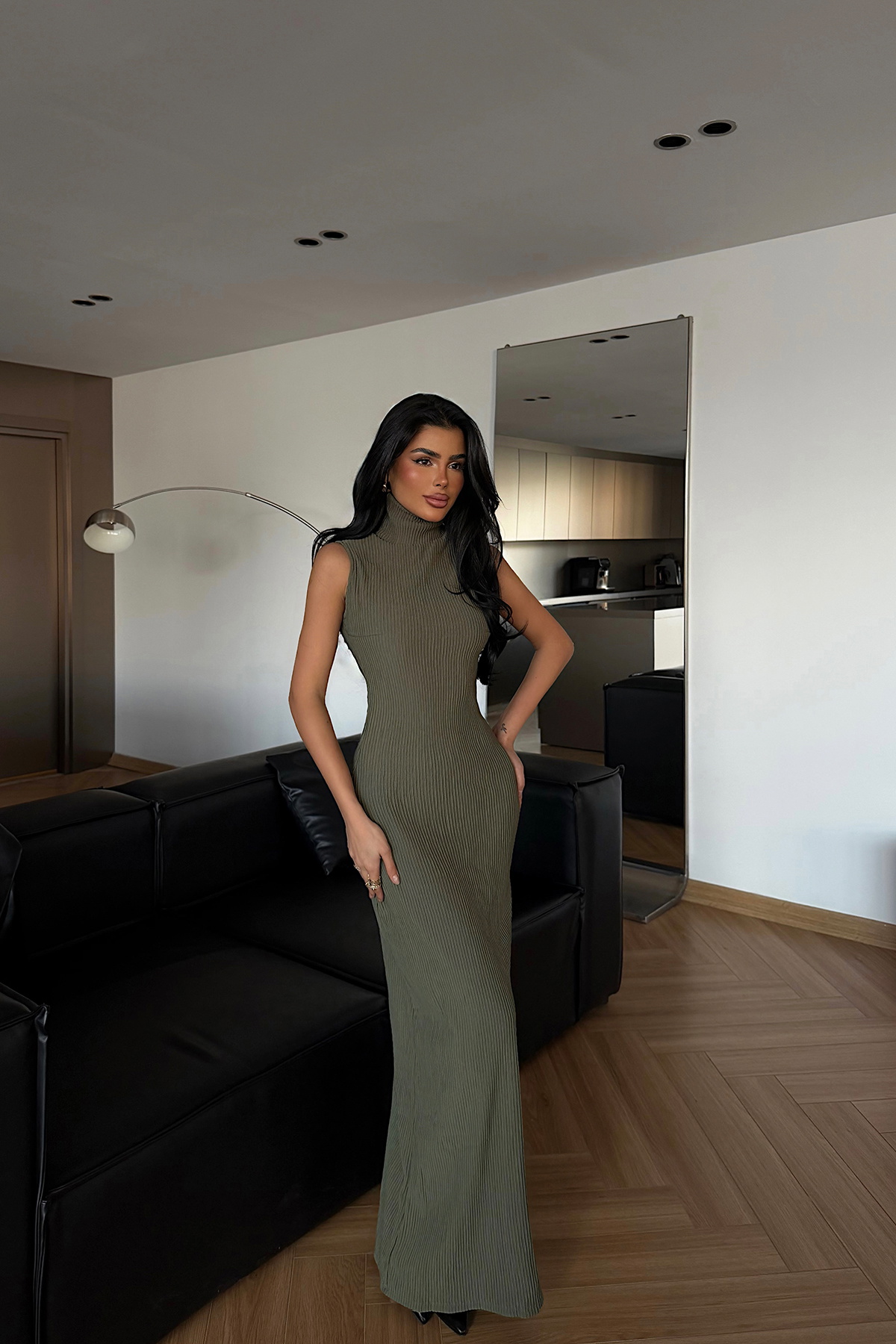 Kolsuz tasarımı ve boğazlı yaka formuyla öne çıkan uzun elbise, vücuda oturan triko yapısıyla zarif ve güçlü bir siluet sunar. Akıcı formu ve sade çizgileri sayesinde özel davetlerde ve şık akşam kombinlerinde modern ve feminen bir görünüm sağla