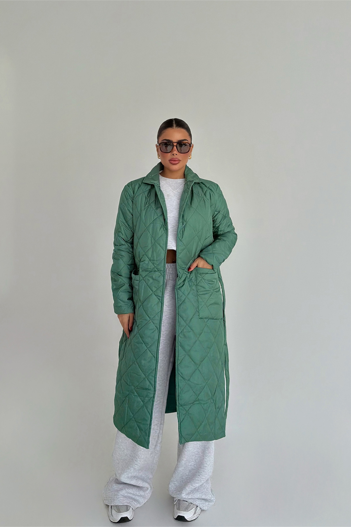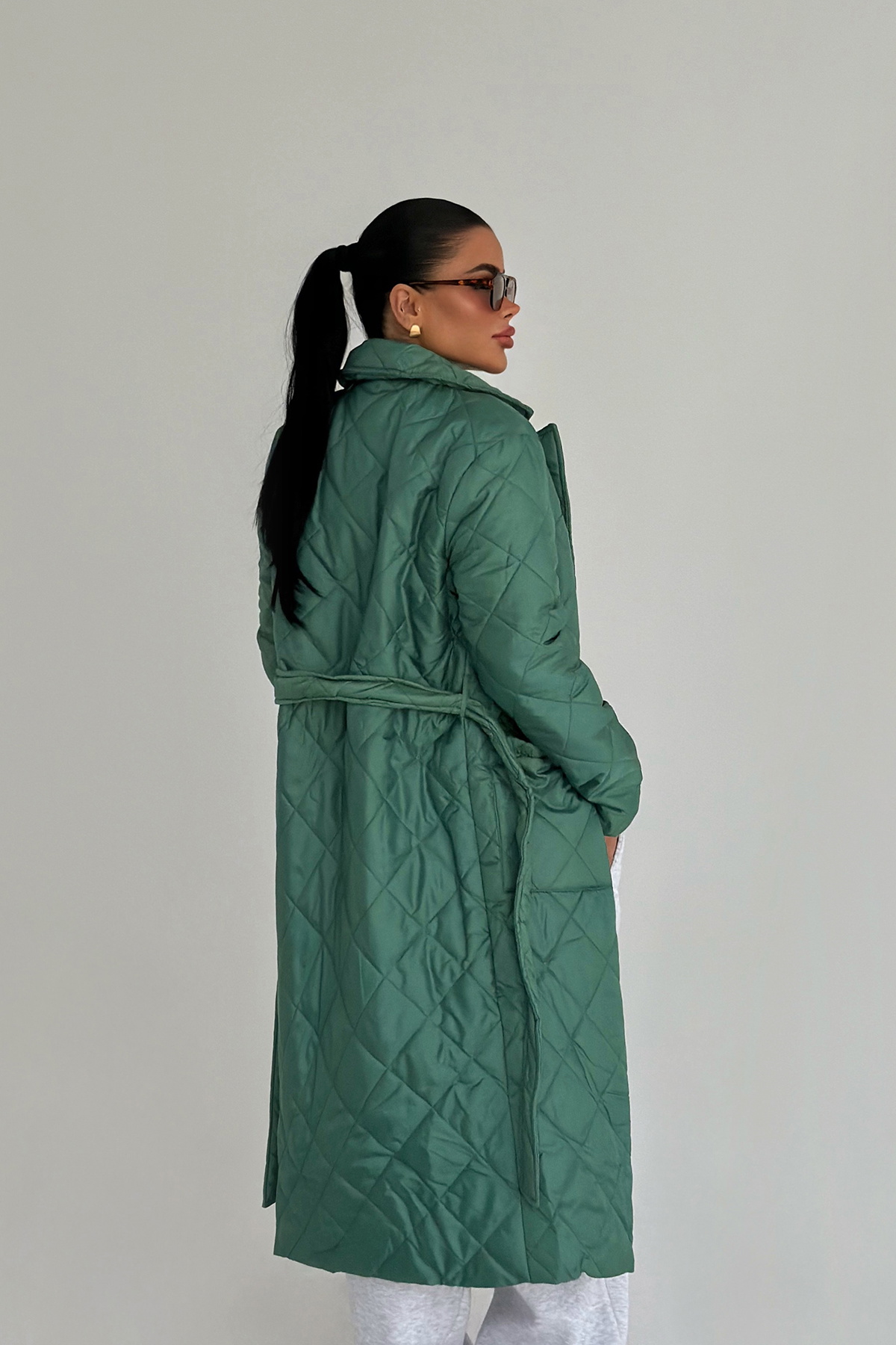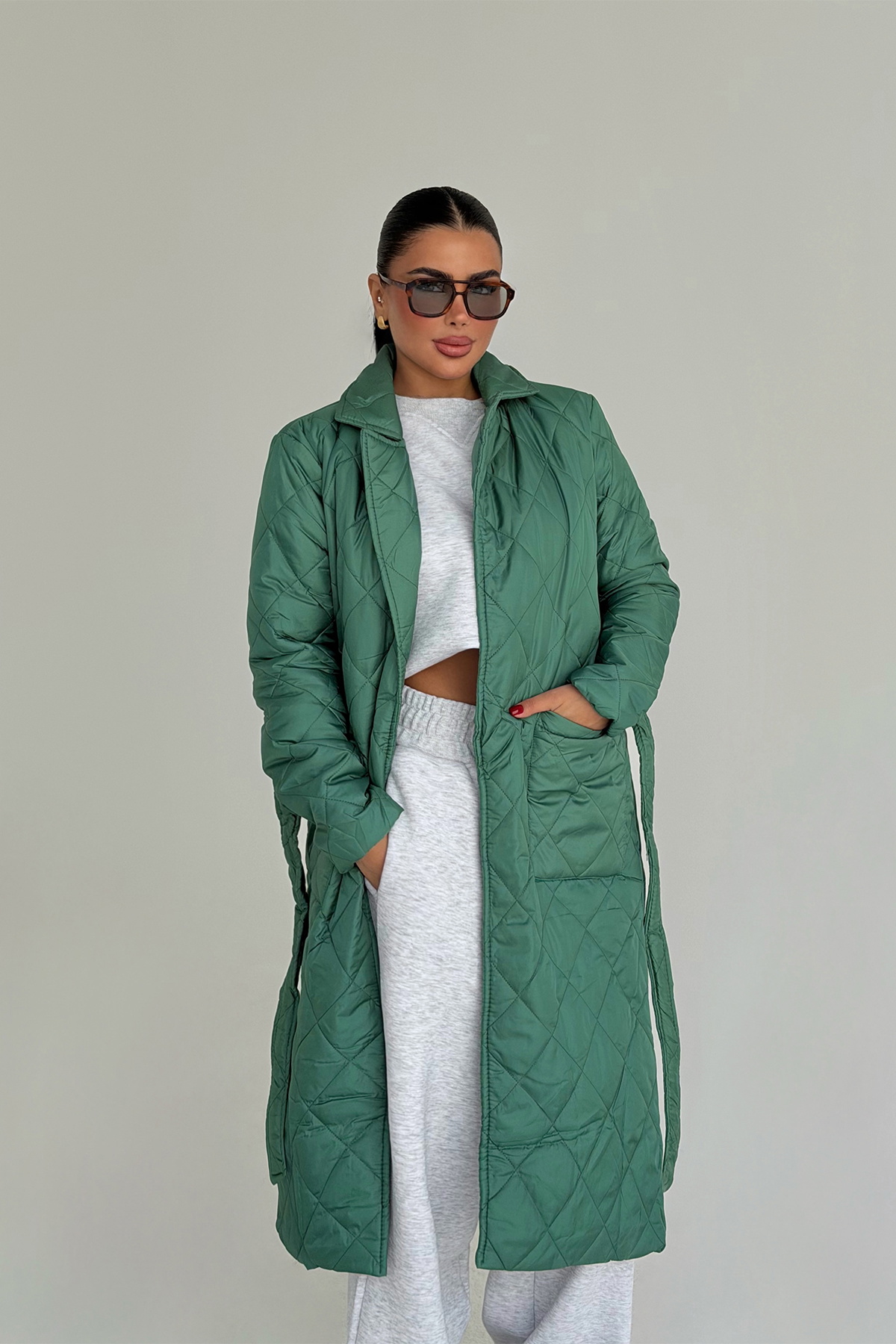 Bu yeşil kapitone mont, şık ve fonksiyonel bir dış giyim parçasıdır. Kapitone dikişli tasarımı sayesinde hem yalıtımı yüksek hem de hafif bir yapı sunar.