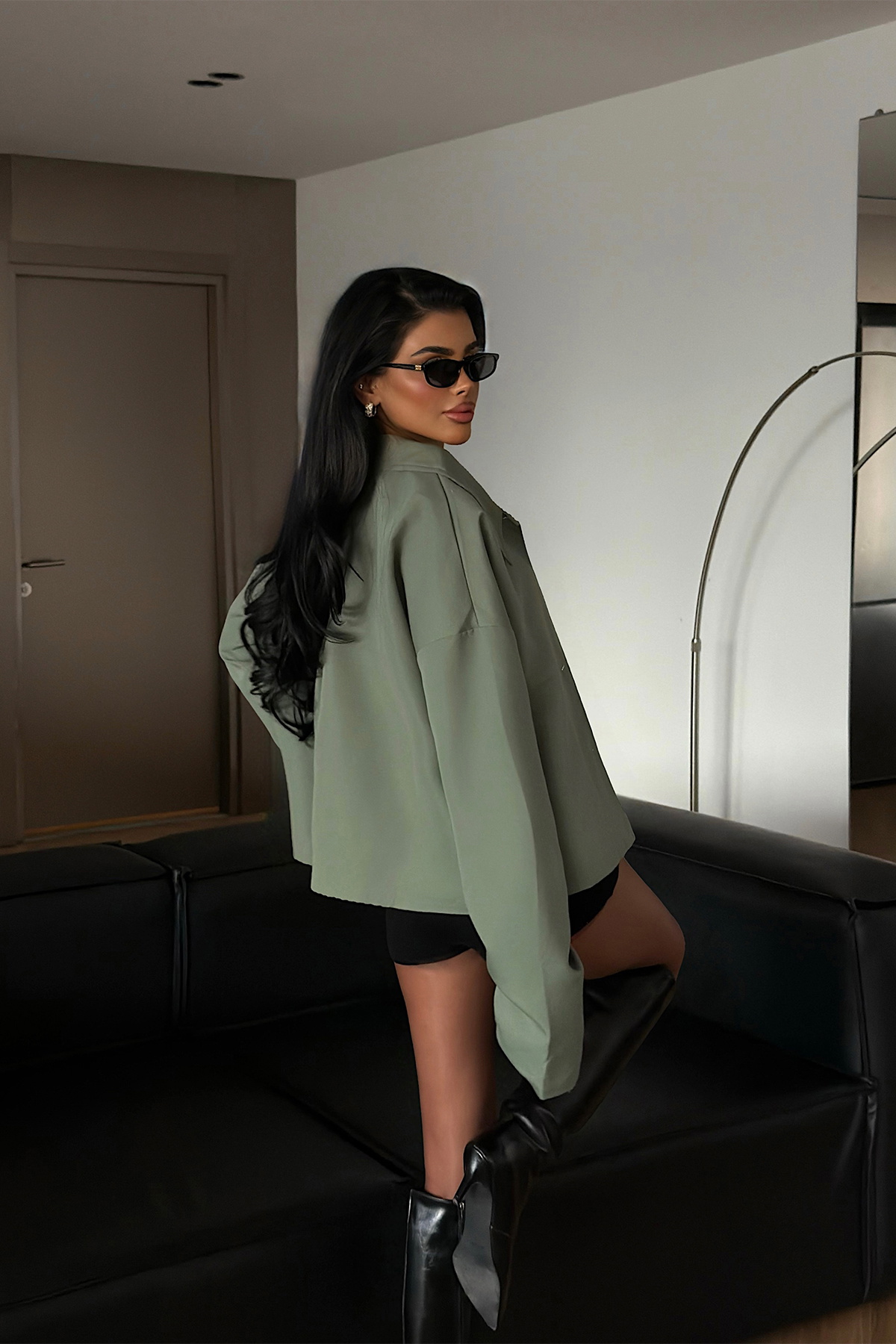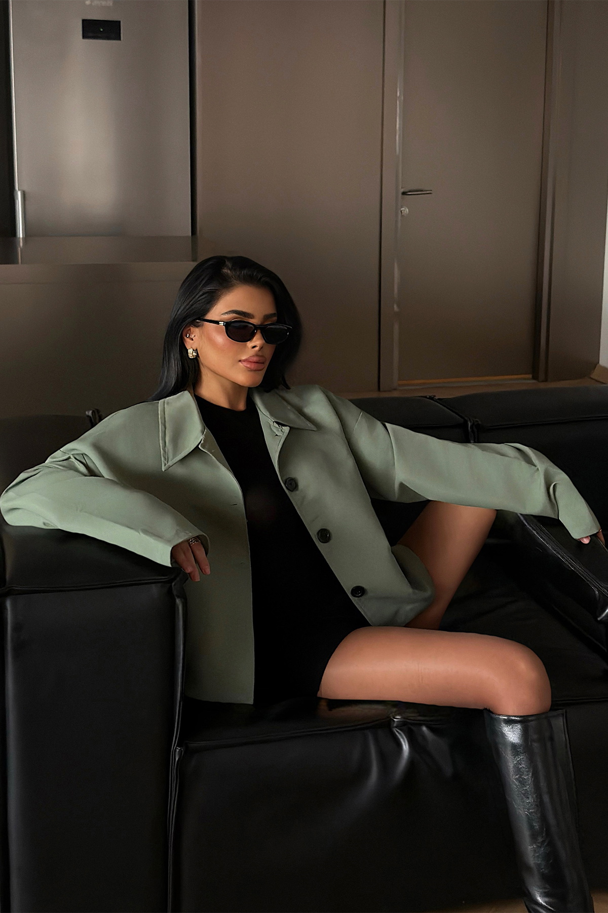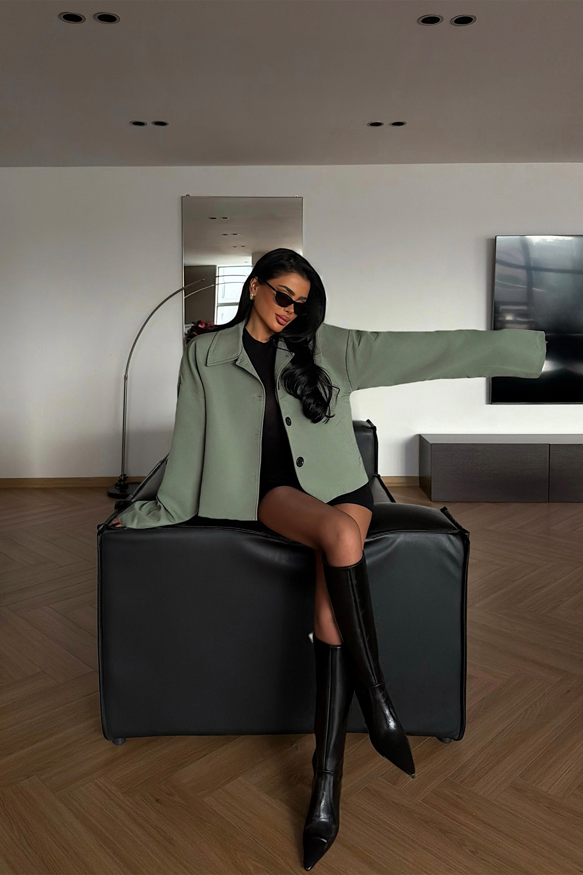 Düğmeli tasarımı ve kısa kesimiyle öne çıkan trençkot, tok dokulu yapısı sayesinde modern ve net bir siluet sunar. Geniş yaka formu ve rahat kalıbı şehir stilinde hem günlük hem de şık kombinlerle kolayca uyum sağlar.
