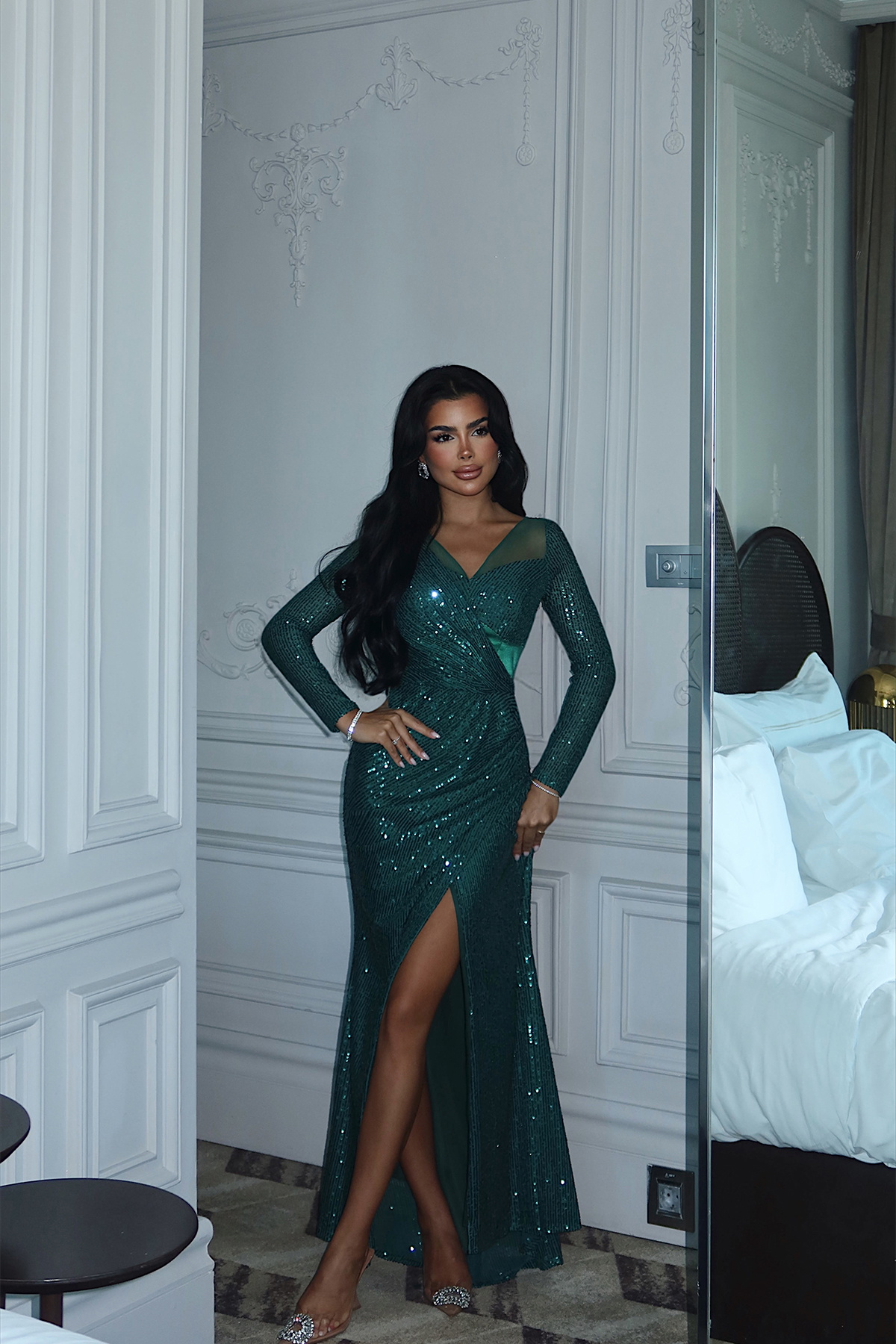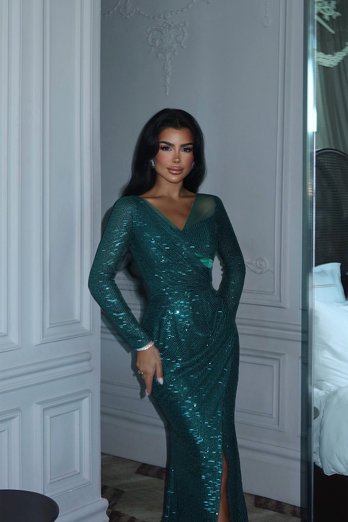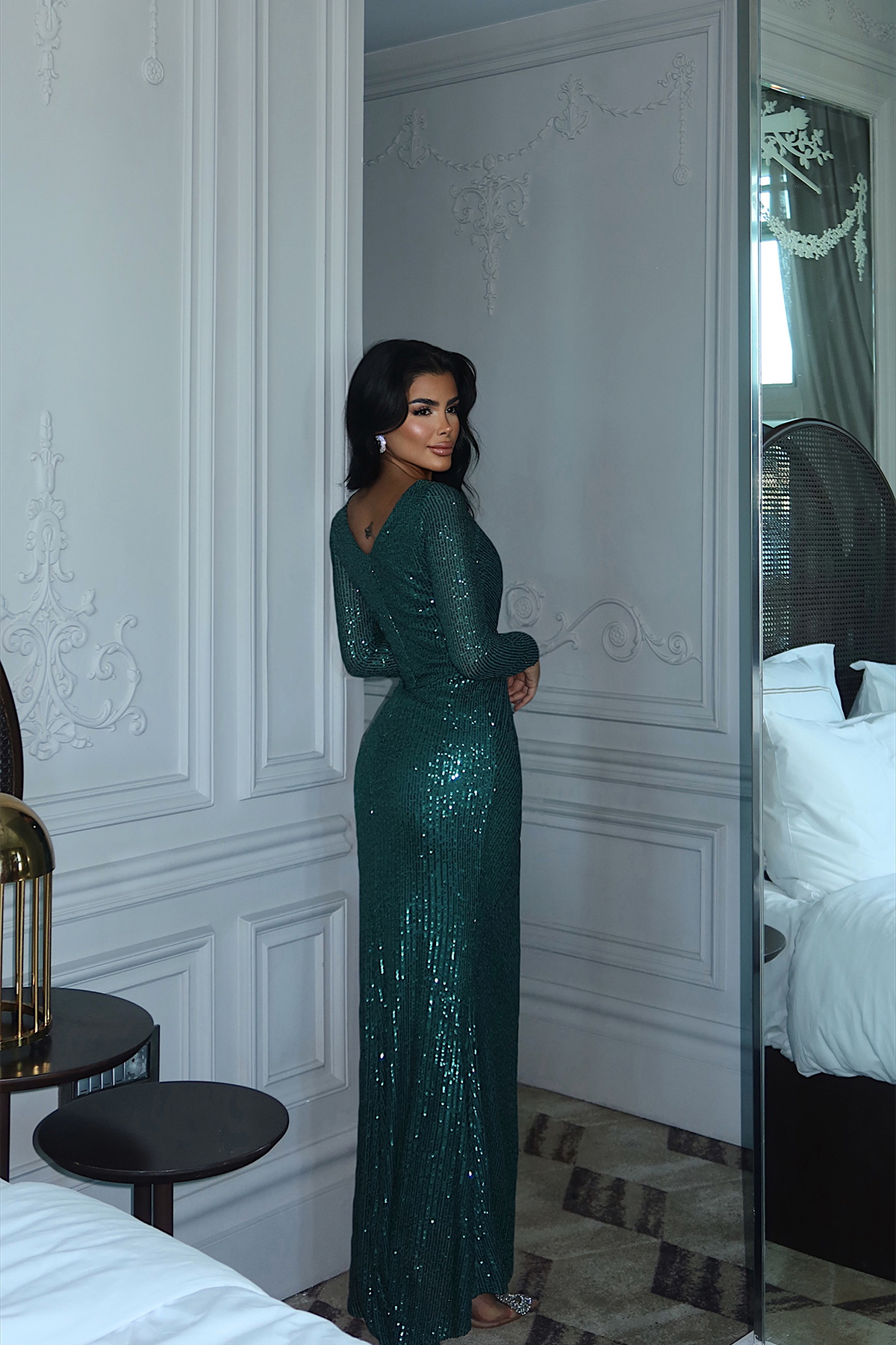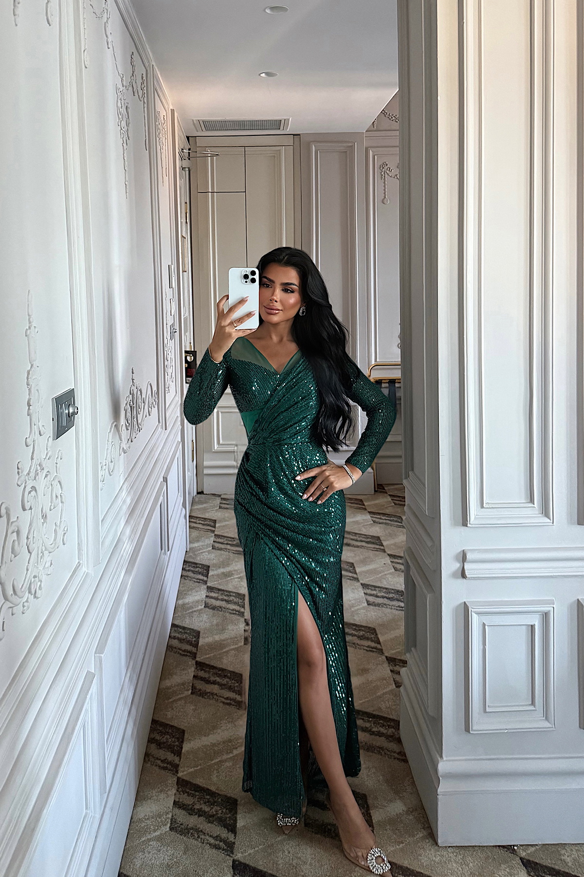 Yeşil Tamera Uzun Kollu Payetli Abiye – Işıltılı ve Zarif Tasarım