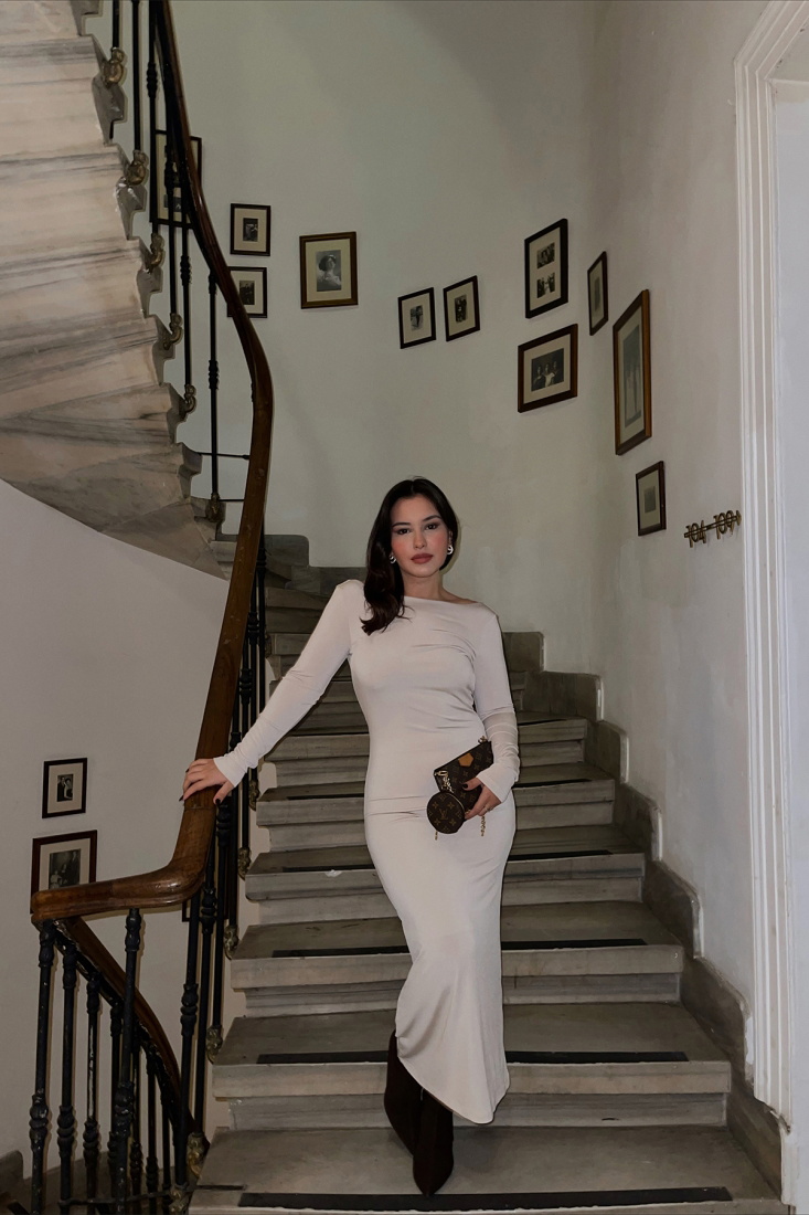 Krem Sırt Detay Uzun Elbise ATE3004